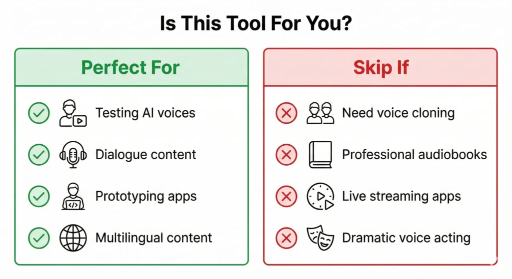 Skip if: You need voice cloning, require consistent output for long-form audiobooks, or want maximum emotional expression. ElevenLabs handles those better.