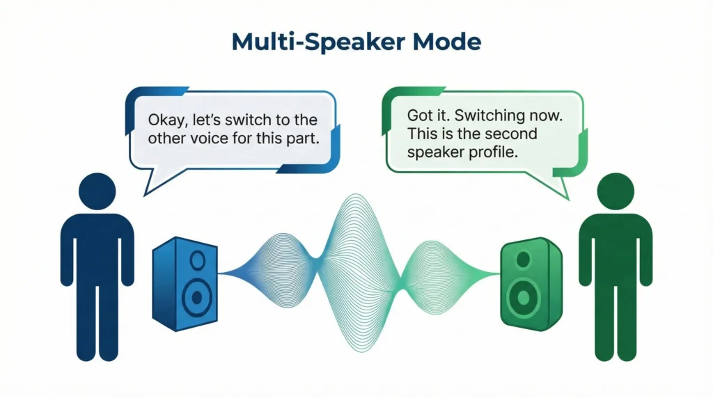 Character voices stay consistent across conversations. Previously, multi-speaker mode would sometimes blend voices or lose character identity mid-dialogue. The December update maintains distinct voices throughout longer scripts.