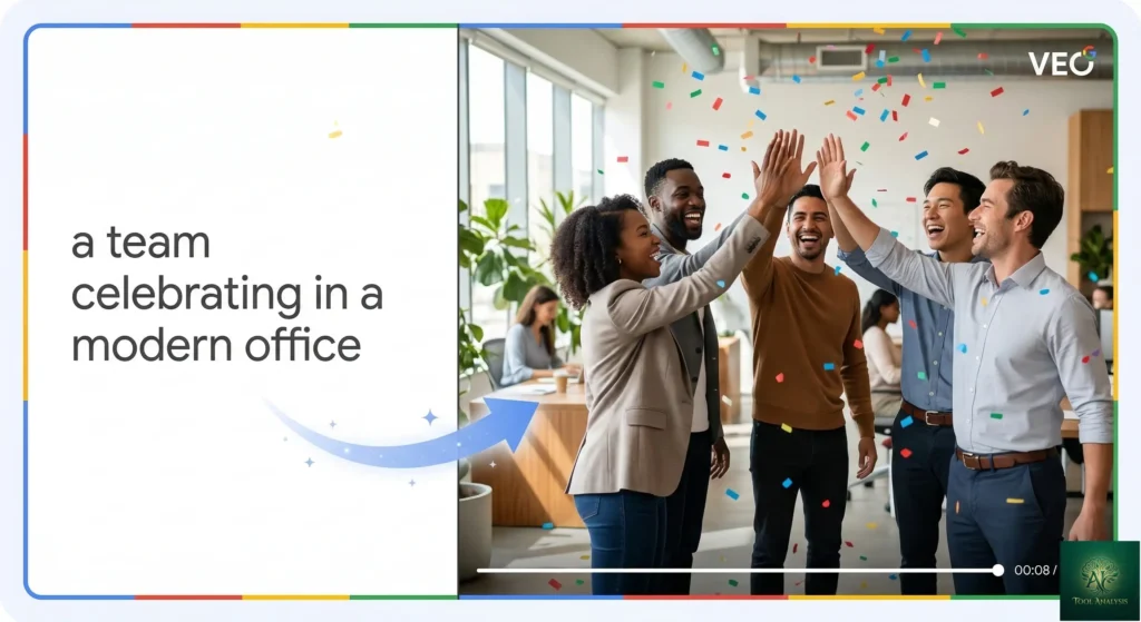 The Veo 3 integration (added late 2025) is the most exciting addition. You can generate 8-second AI video clips from text prompts with realistic motion and native audio. Type “a team celebrating hitting their quarterly goals in a modern office” and Veo 3 creates a short clip you can drop into your video. It’s not going to replace your B-roll footage library, but for quick internal videos, it’s genuinely useful.
