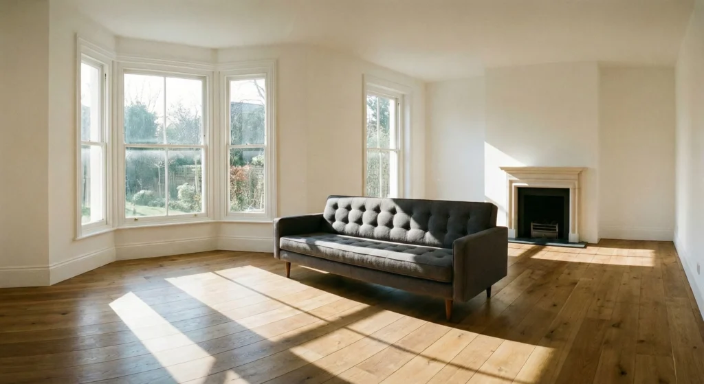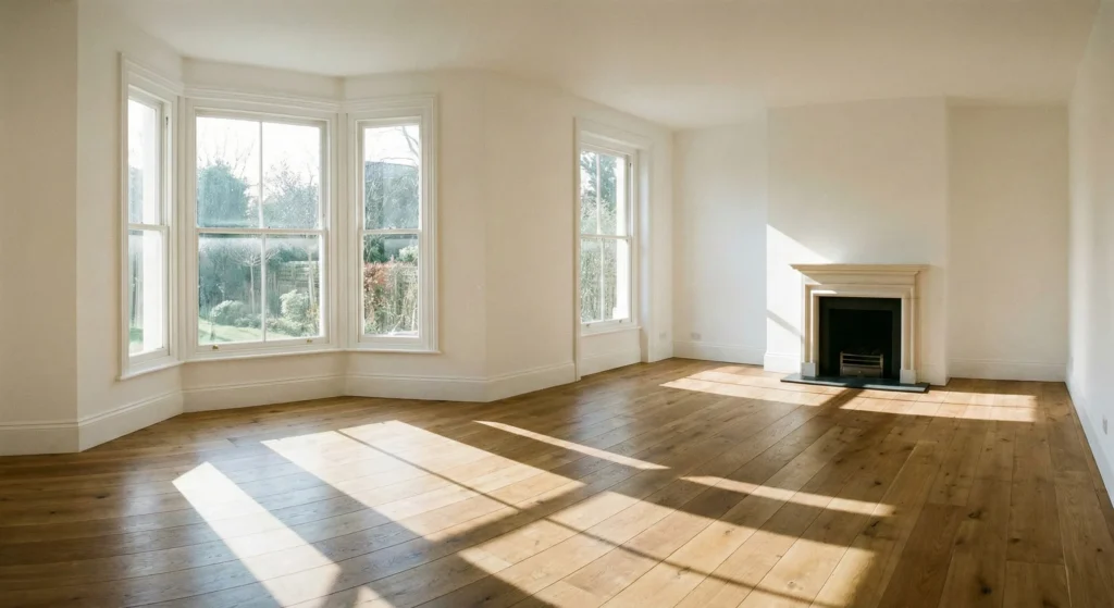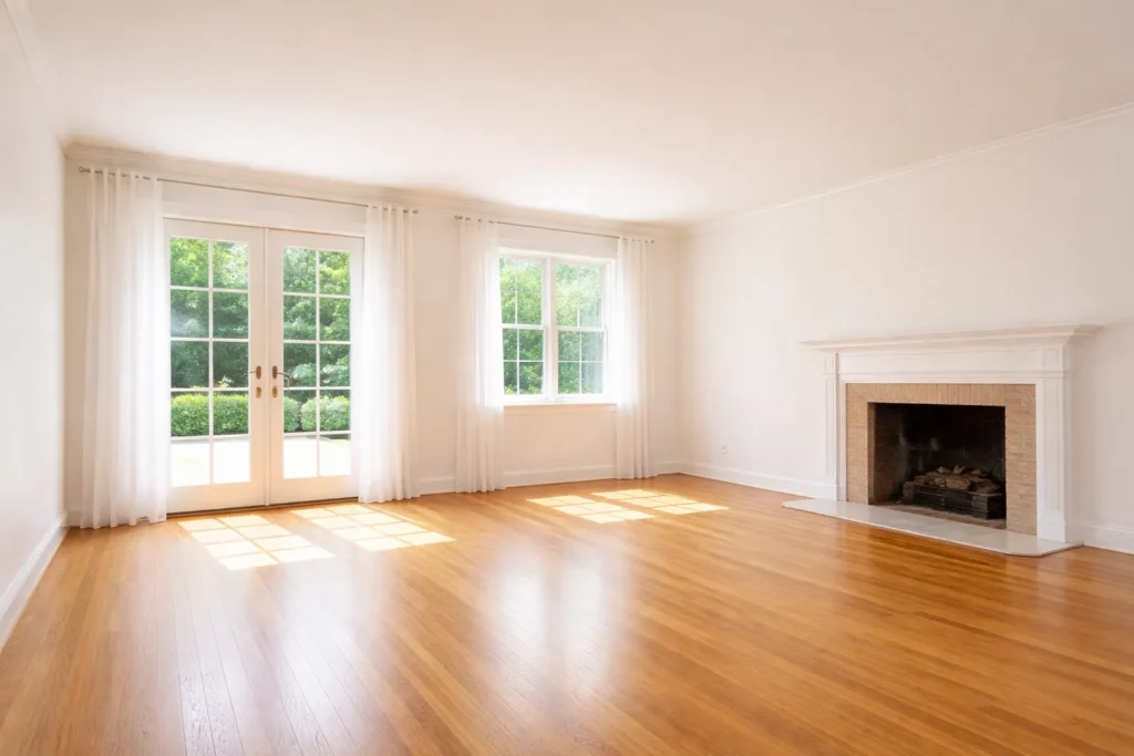 - Input: Generate an empty, sunlit living room with white walls and wooden floors.