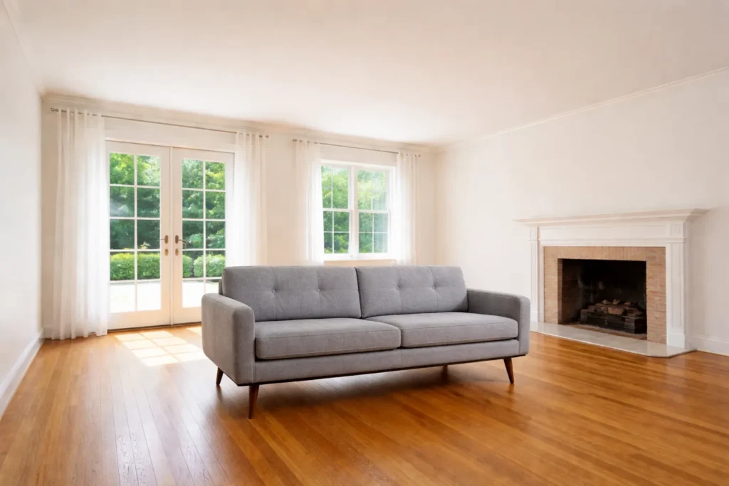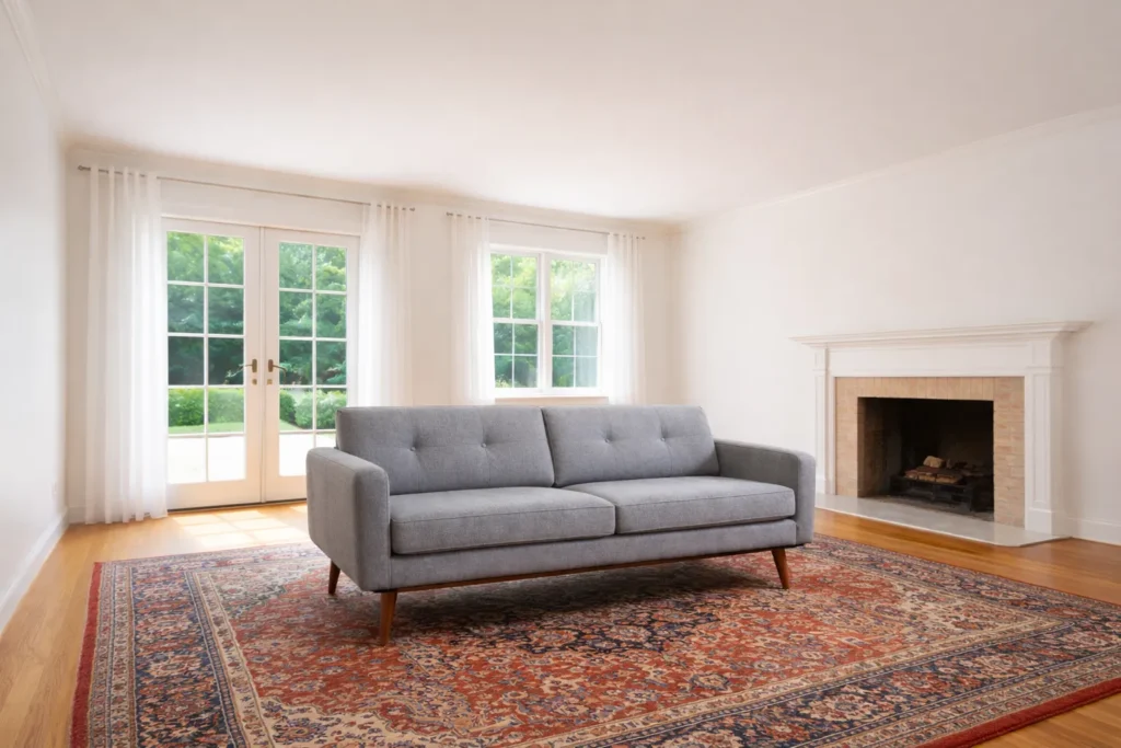 - Edit 1: “Place a mid-century modern grey sofa in the center.”