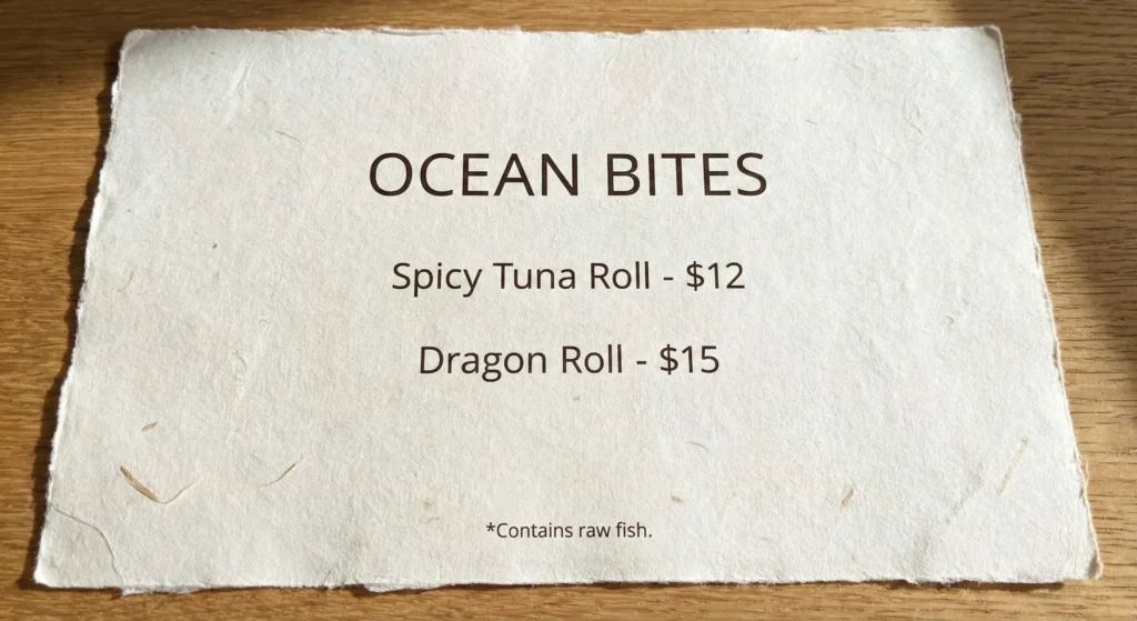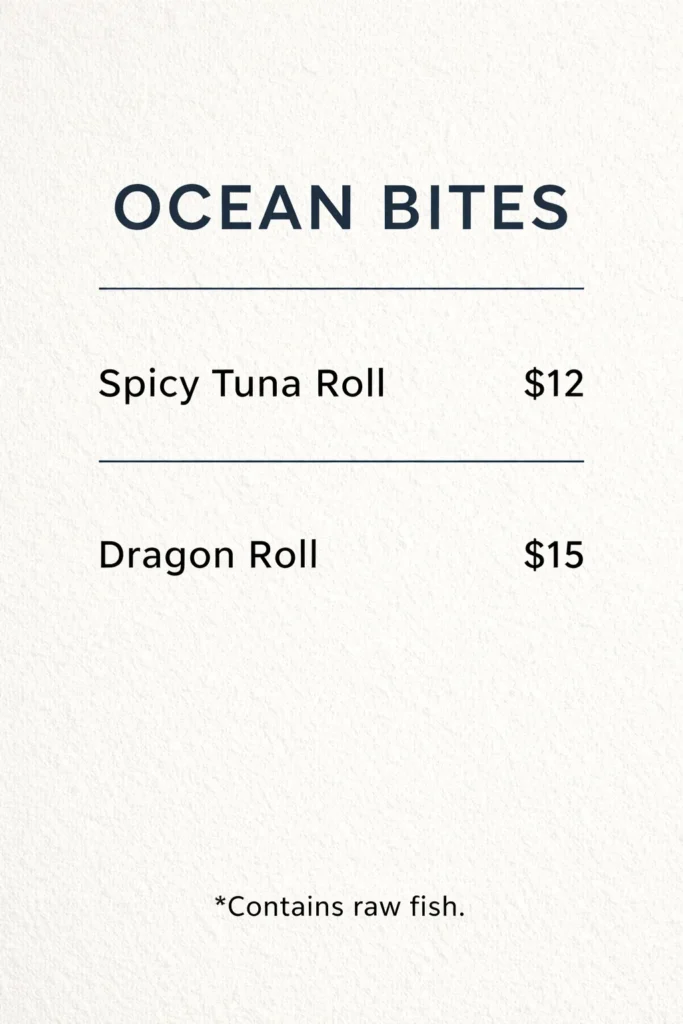 “A minimalist sushi menu on textured paper. Title: OCEAN BITES. Item 1: Spicy Tuna Roll – $12. Item 2: Dragon Roll – $15. Footer: *Contains raw fish.”