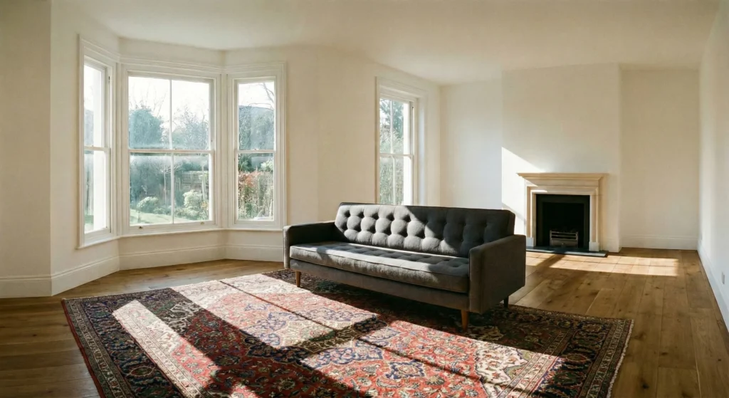 - Edit 2: “Add a large Persian rug underneath the sofa.”