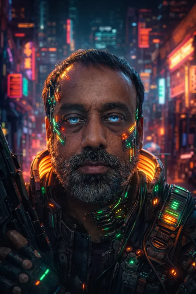 - “Generate this person as a gritty Cyberpunk 2077 mercenary with neon implants.”