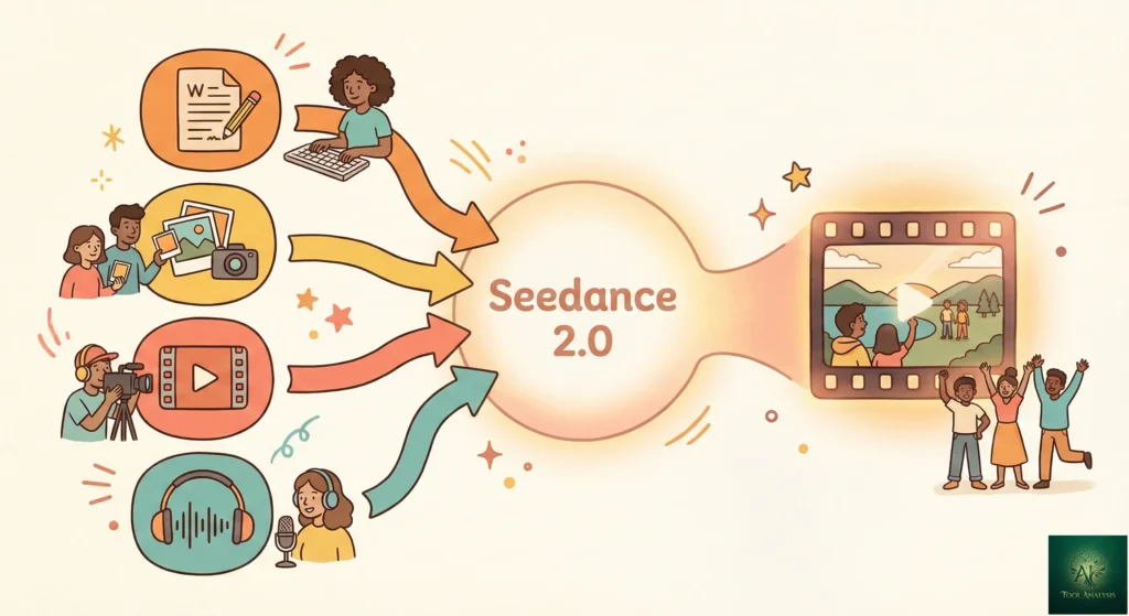 Traditional AI video tools work like shouting instructions to someone wearing earplugs. You describe what you want, the AI takes a guess, and you roll the dice. Seedance 2.0 flips this entirely by introducing what ByteDance calls “multimodal all-round reference.” Think of it as handing your AI assistant a mood board, a choreography video, and a soundtrack, then saying “make something exactly like this.”