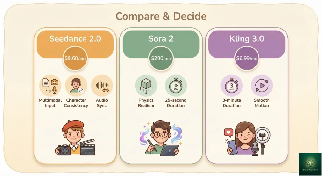 How it compares to competitors: Sora 2 starts at $200/month (ChatGPT Pro) for full 1080p access. The $20/month ChatGPT Plus tier caps video at 720p. Veo 3.1 requires Google AI Ultra at $250/month. Kling AI starts at $6.99/month but offers different capabilities. Seedance 2.0 is positioned as the most accessible option for creator-grade AI video.